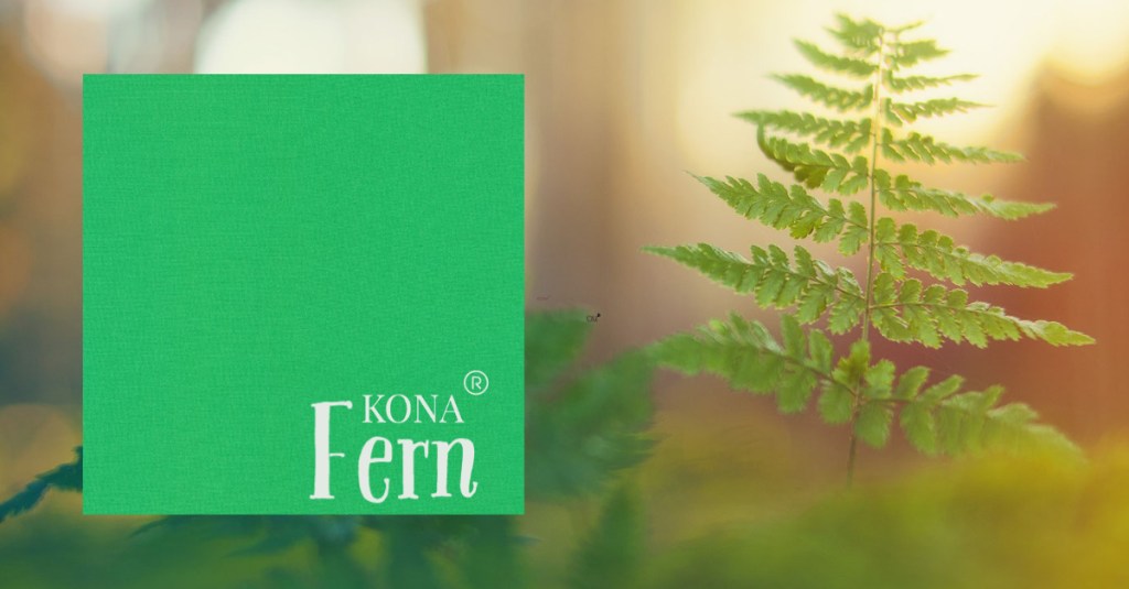 What a pop of green this color has. It isn’t as subtle as expected. Of course, ferns can do that. Every year I put a pot on my porch and run to the local nursery to pick up a large fern to fill it with. It always catches my eye when I come home and see it’s graceful leaves spilling over the top of my well-placed pot. This Kona Fern is bright and fun. It can be added to your project to bring brightness and life to the movement of the colors.